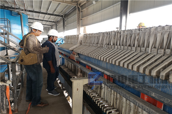 上圖:國外客戶在現(xiàn)場了解隆中壓濾機使用方法:
