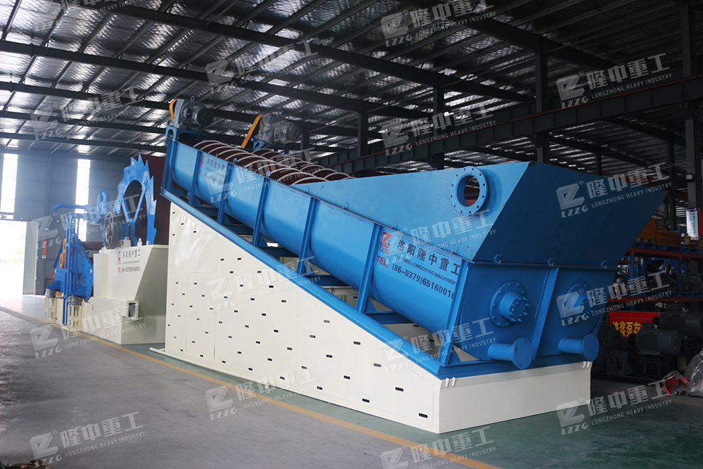 砂石物料經(jīng)篩分設(shè)備分級過濾合格產(chǎn)品通過流槽管道流入螺旋攪拌機(jī),經(jīng)螺旋攪拌機(jī)充分清洗、浸泡、打碎(針對泥性較大) 尾礦水排入一段分離裝置濃縮、分級;尾礦及粗礦同時進(jìn)入水車進(jìn)行清洗、脫水,尾礦水排入二段分離裝置濃縮、分級,尾礦及粗礦再次同時進(jìn)入脫水除泥裝置;經(jīng)高頻振動電機(jī)充分脫水干排成品由成品輸送帶堆放料堆進(jìn)行出售。